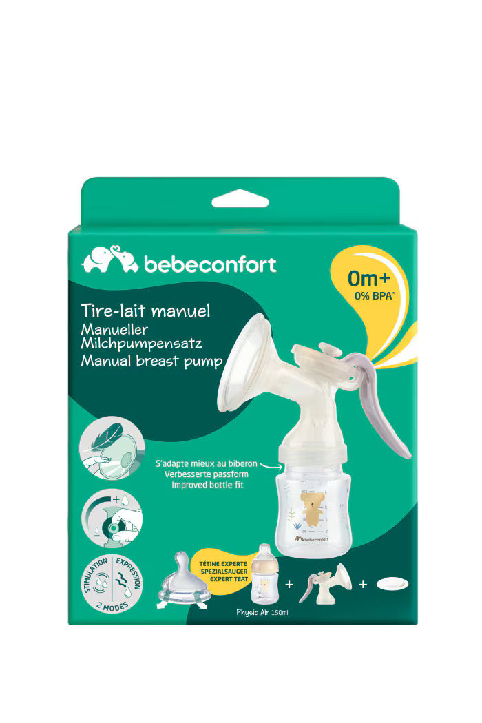 Bebeconfort's manual breastpump is the essential accessory for new mums wanting a practical, affordable and discreet solution to pump milk at home or away. It is compact , lightweight and easy to clean. It comes complete with the manual breast pump, a 150ml Physio baby bottle to collect the milk and feed your baby straightaway, an expert Physio Air teat and a seal disc . The breastpump has 2 modes: a stimulation and expression mode and adjustable suction intensity. Its soft silicone cup rests comfortably on mum's breast and fits most women.